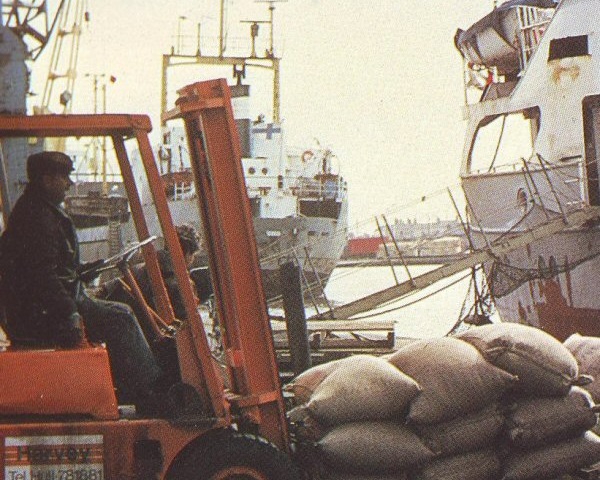 The charter business also flourishes at Goole. Iron and steel of all kinds, packaged timber and timber products, bagged fertilizers and chemicals in drums, fresh fruit and vegetables are 'bread and butter' business to the port's dockworkers who are proud to display the traditional stevedoring skills which have disappeared elsewhere.